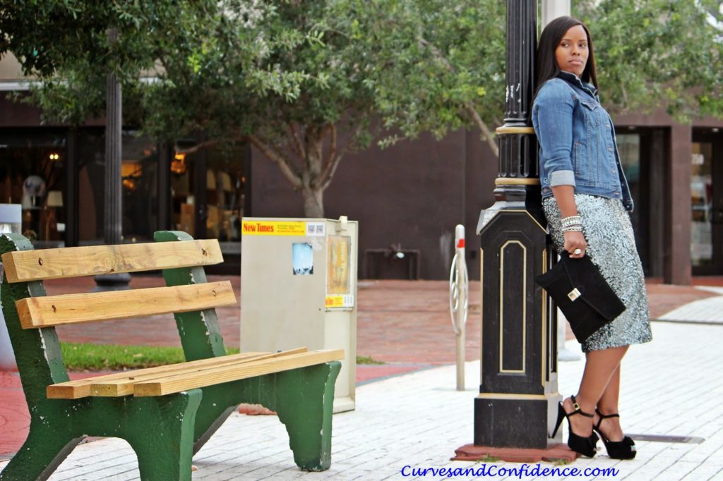I love this look, the mix of the sequins skirt and the jean jacket is a great mix!!!